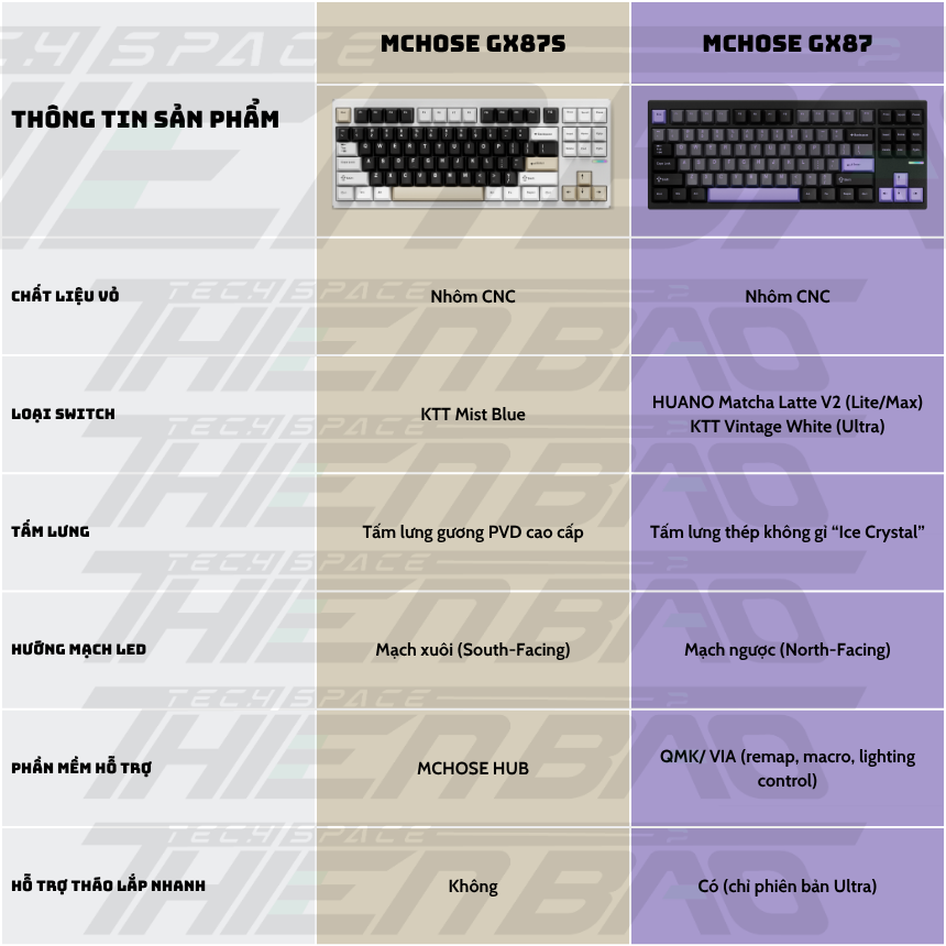 - Dòng bàn phím MCHOSE GX87 và GX87S đều nằm trong phân khúc cao cấp với thiết kế vỏ nhôm CNC nguyên khối, cấu trúc gasket mount và hệ thống foam tiêu âm nhiều lớp. Tuy có ngoại hình tương đồng, nhưng hai phiên bản này vẫn có những khác biệt tinh tế về trải nghiệm gõ, LED và khả năng tùy chỉnh phần mềm.