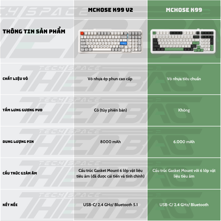 Dòng bàn phím MCHOSE K99 V2 và K99 đều hướng tới người dùng cao cấp với layout kiểu compact fullsize (gần như full), hỗ trợ kết nối đa chế độ và khả năng tùy chỉnh bằng phần mềm MCHOSE HUB. Mặc dù có nhiều điểm chung về thiết kế và cấu trúc, hai phiên bản vẫn có những khác biệt quan trọng về pin, hiệu năng, đèn nền và các nâng cấp phần cứng.