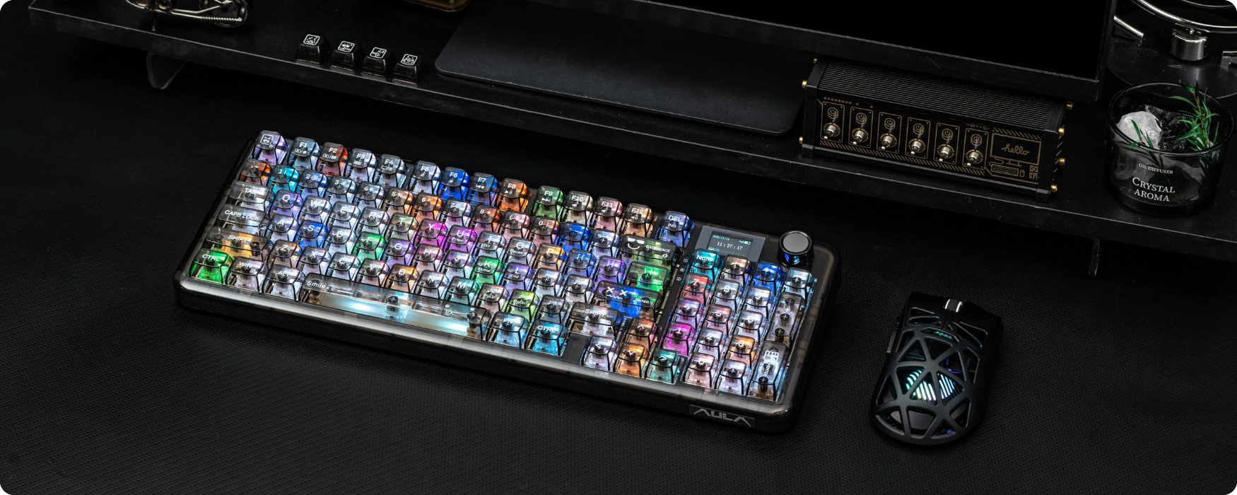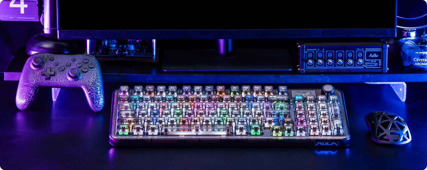 Aula F-NB98 được thiết kế trong suốt tạo hiệu ứng thị giác mạnh, phù hợp cho cả nhu cầu giải trí và văn phòng. Vỏ bàn phím độ trong suốt cao giúp hiển thị rõ cấu trúc linh kiện bên trong mang lại tổng thể hiện đại cho góc làm việc, kết hợp với đó là keycap bán trong suốt và LED mạch ngược (north-facing), mỗi lần nhấn phím đều được chiếu sáng rõ ràng nhất.