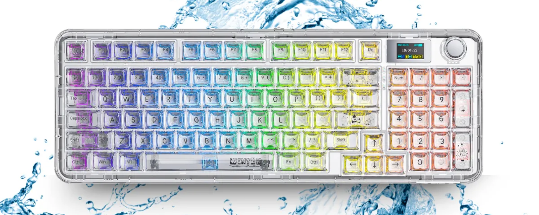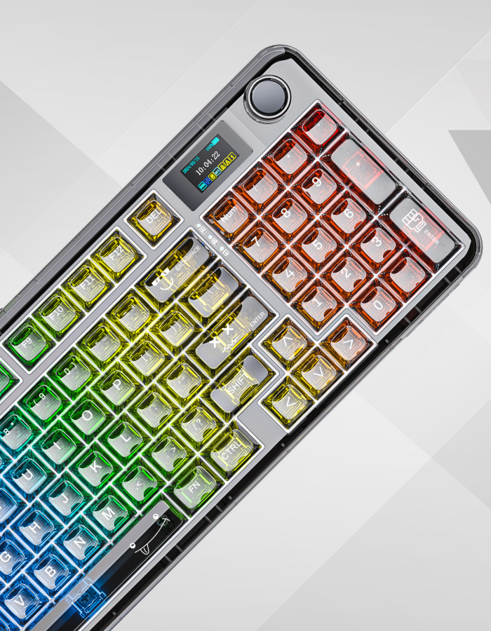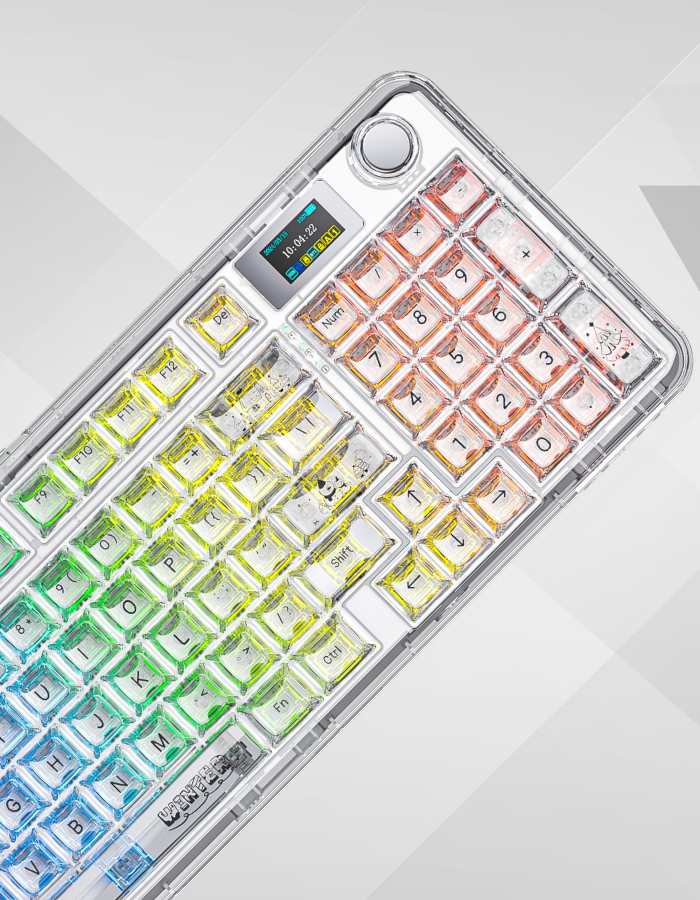 Layout 96% được thiết kế nhằm tối ưu diện tích bàn nhưng vẫn giữ đầy đủ các phím chức năng quan trọng, bố cục này giúp thao tác thuận tiện cho cả gõ văn bản và chơi game mà không chiếm nhiều không gian. Ngoài ra, màn hình hiển thị tích hợp cung cấp thông tin như mức pin và trạng thái kết nối, giúp người dùng theo dõi nhanh mà không cần kiểm tra trực tiếp trên máy tính.