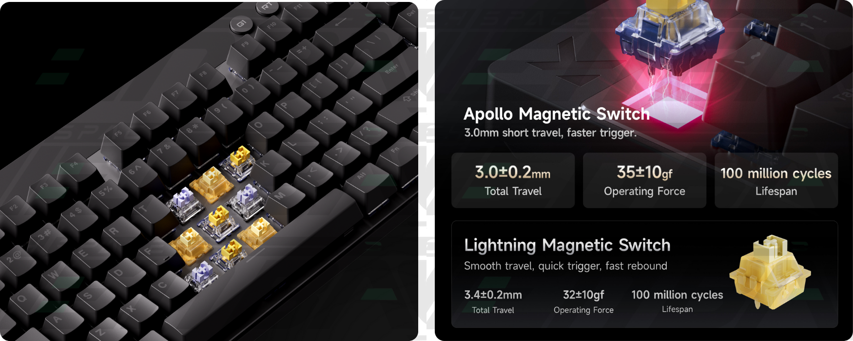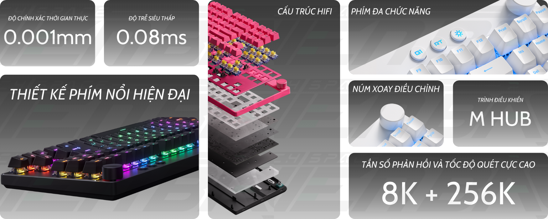 Cùng với đó là độ trễ thực chỉ 0.08ms, kết hợp cùng tần số phản hồi 8K và tốc độ quét lên đến 256K, đạt chuẩn thi đấu eSports chuyên nghiệp. Các phím quan trọng như WASD được kết nối trực tiếp với chip ADC, mang lại độ trễ gần như bằng không — giúp bạn giành lợi thế trong từng khoảnh khắc quyết định (0.08ms dành cho bản Ultra Esports Edition, 0.125ms cho bản Advanced Edition).