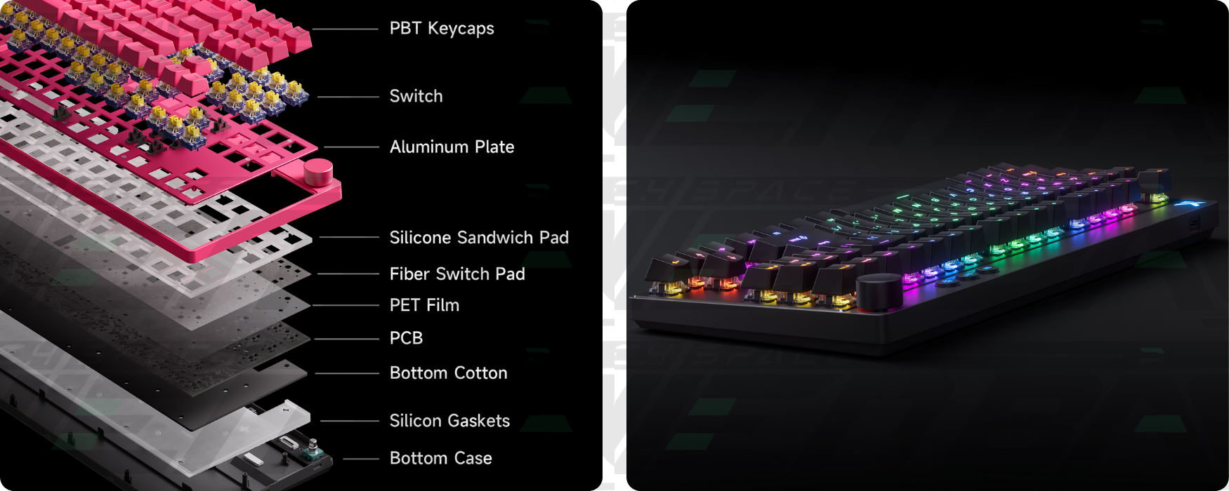 Trải nghiệm âm gõ tinh khiết, rõ ràng nhờ thiết kế cấu trúc giảm chấn 5 lớp, gồm đệm silicon sandwich, lớp đệm switch bằng sợi, màng PET, lớp đệm đáy và gioăng silicon. Cấu trúc này giúp kiểm soát rung và tiếng ồn khi gõ, đồng thời mang lại cảm giác nhấn ổn định và cân bằng.